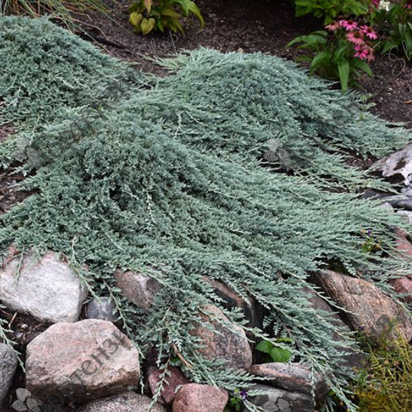 Можжевельник горизонтальный Айс Блю- карликовй кустарник высотой не более 15 см, в ширину может достигать двух метров, с  голубовато-зеленым окрасом хвои. Обладает длинными стелющимися побегами, которые зимой меняют цвет с голубовато-зеленого на фиолетово-сливовый. К почвам кустарники данной формы не требовательны, однако не переносит застойного переувлажнения и засоления почвы. Светолюбив, засухо- и морозоустойчив. Достаточно мощная корневая система позволяет использовать это почвопокровное растение для укрепления откосов и склонов, часто применяется для высадки на каменистые подпорные стенки.
