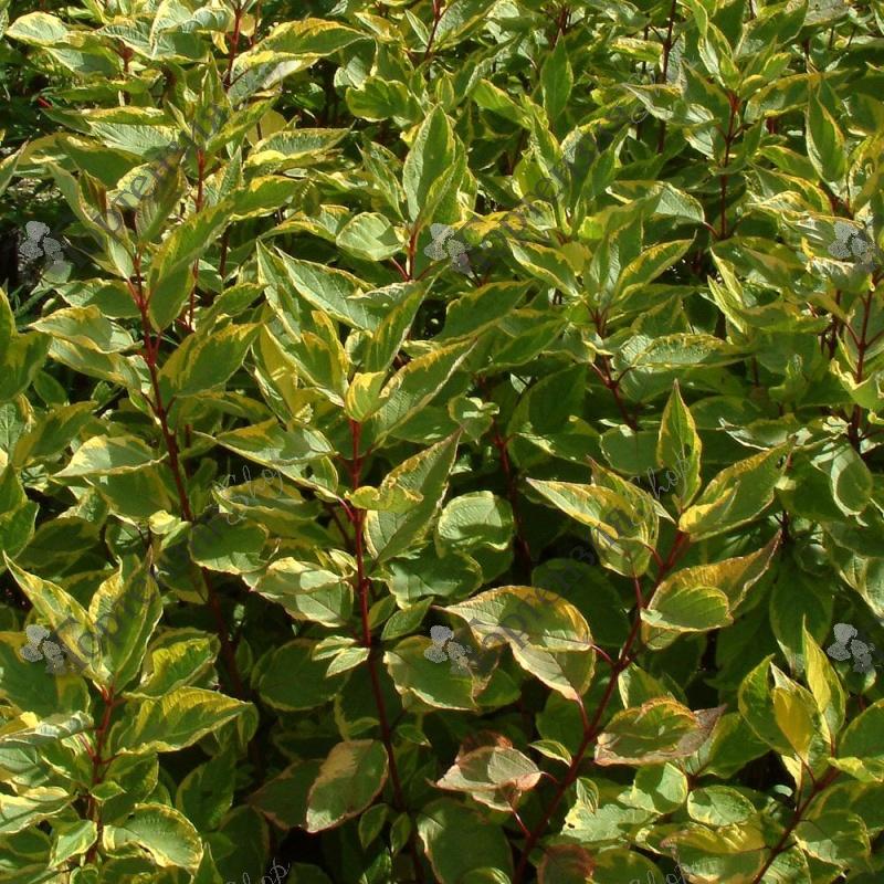 Дерен белый (Cornusalba) Шпэти- неприхотливый, листопадный, раскидистый кустарник семейства Кизиловых высотой и шириной 2,5-3 м. Стебли красные. Листья зеленые с желтым неравномерным окрасом, осенью фиолетовые. Цветки белой, чуть голубоватой окраски, соцветие щиток. Плод костянка, несъедобный. Используется для одиночной и групповой посадки и как элемент живой изгороди. Растет на любых плодородных почвах. Морозостиойкость -35 С.