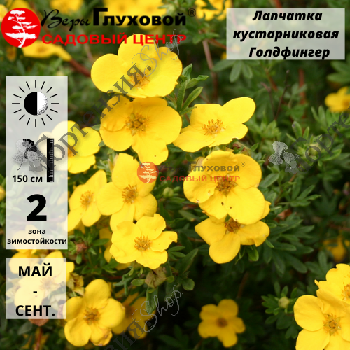 Лапчатка 'Голдфингер' (Potentilla fruticosa 'Goldfinger') – кустарниковое растение, раскидистое высотой до 120 см. Листья зеленые пальчато-рассеченные. Цветок из пяти лепестков ярко-желтого цвета крупные, диаметром 5 см. Цветет с июня по ноябрь непрерывно. Украсит парки, скверы, миксбордеры, в качестве живой изгороди. К почвам не требовательна. Растёт быстро. Cветолюбив, но выносит и полутень. Зимостоек. Морозостойкость -40С.