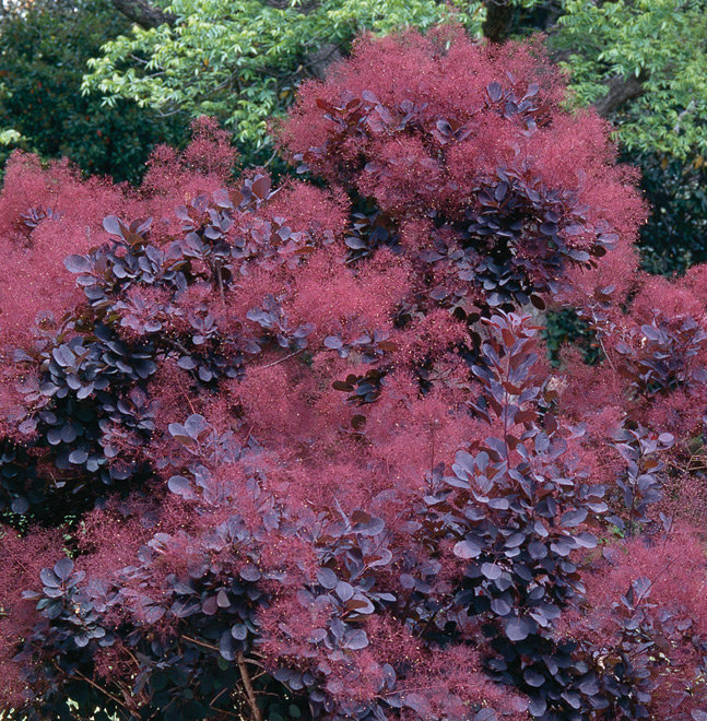Скумпия кожевенная Роял Пурпл (Cotinus coggygria 'Royal Purple') - кустарник до 2–3 м высотой, с раскидистой, почти шаровидной кроной.Годовой прирост составляет 50 см. в высоту и 50 см. в ширину. Сорт с винно-фиолетовыми листьями с металлическим блеском. Цветки мелкие, собраны в верхушечные метельчатые соцветия до 20 см длиной, окутывающие куст с VІІ по Х, как пушистое тёмно-розовое облако. Недостаточно зимостойка, цветёт редко и рекомендуется как порослевая культура.