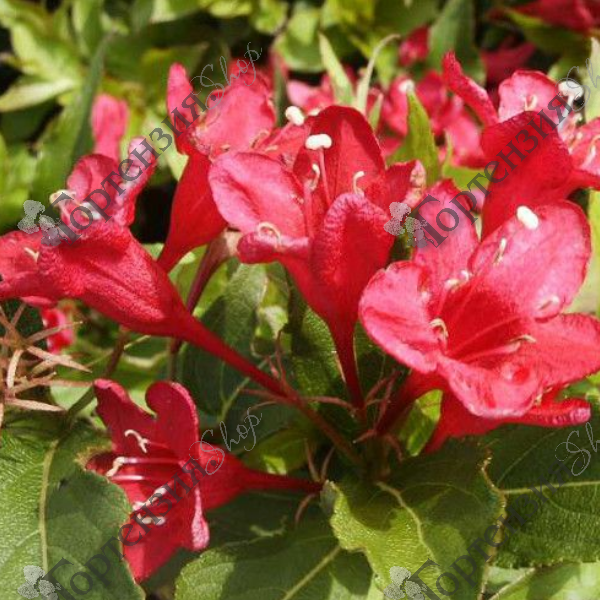 Вейгела цветущая (Weigela florida) Эвита - Небольшой кустарник до одного метра в высоту. Относится к быстрорастущим, скорость роста – 20 см в год. Цветет с июня по август, цветы алого цвета, собранные в соцветия по 3-4 цветка. Любит открытую местность и прямые солнечные лучи, но и в тени будет чувствовать себя неплохо, лишь цветение будет не такое обильное. На зимний период обязательно растение нужно укрывать. Weigela florida «Evita» используется в декоративных посадках как элемент ландшафтного дизайна. Хорошо показывает себя в городских парках и садах, может использоваться как элемент живой изгороди.