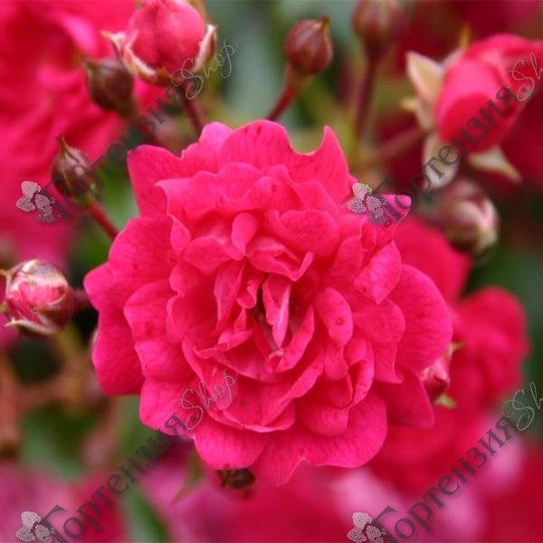 Садовая роза Fairy Queen   Фейри Квин - Королева Фей   - сорт полиантовой розы, открыт R.A. Vurens (Нидерланды.). Куст густой, высотой 50- 80 см, шириной 35 см, обильно цветущий множеством густо махровых округло чашевидной формы цветков темно розового, средне красного цвета, собранных в большие кластеры. Аромат мягкий, яблочный. Листва глянцевая, светло зеленая.  Цветение волнами в течение всего сезона.