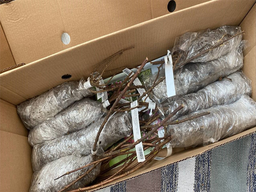 Для фиксации неподвижного состояния и предотвращения передвижения растений добавляется упаковочная бумага и бамбуковая опора. Заказ тщательно упаковывается в надёжную картонную коробку, наклеивается ВЕРХ, хрупкое и штрихкод. Заказ комплектуется перечнем растений, инструкцией по посадке и буклетом (при условии покупки от 3-х растений).